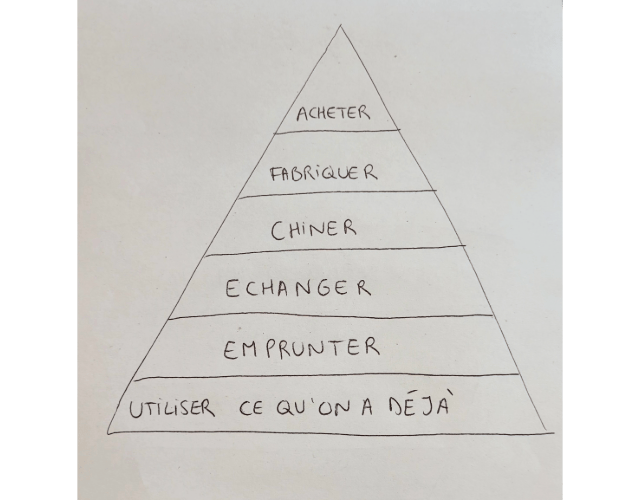 Louer, emprunter, échanger. Avant d’acheter, posez-vous la question : est-ce que je peux obtenir cet objet d’une autre manière ? La pyramide de Sarah Lazarovic illustre ça très bien — je vous la résume (grossièrement) ici 👇
