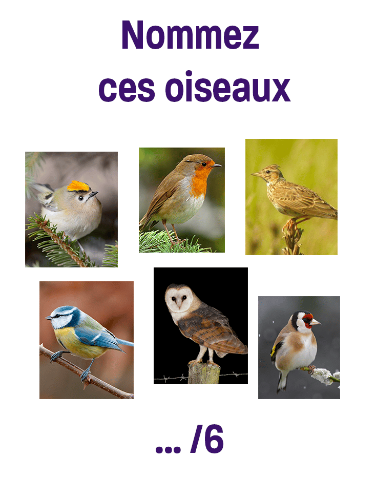 Réponse au quiz spécial oiseaux (de haut en bas et de gauche à droite) : roitelet huppé, rouge gorge, alouette des champs, mésange bleue, effraie des clochers, chardonneret élégant