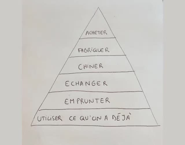 Louer, emprunter, échanger. Avant d’acheter, posez-vous la question : est-ce que je peux obtenir cet objet d’une autre manière ? La pyramide de Sarah Lazarovic illustre ça très bien — je vous la résume (grossièrement) ici 👇
