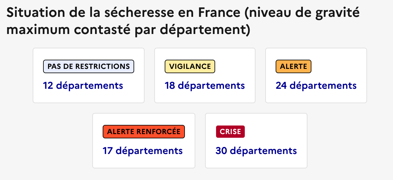 Seuls 12 départements ne sont pas soumis à des restrictions d’eau, d’après le relevé que nous avons fait vendredi sur VigieEau
