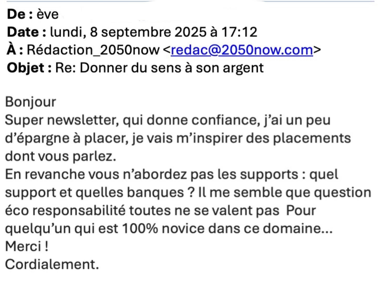 La newsletter sur les placements verts continue de vous faire réagir. Eve pose une bonne question. On n’a pas abordé les banques car c’est encore un autre sujet… sur lequel on va plancher ! Merci de vos partages précieux, c’est avec vous qu’on fait grandir le média.