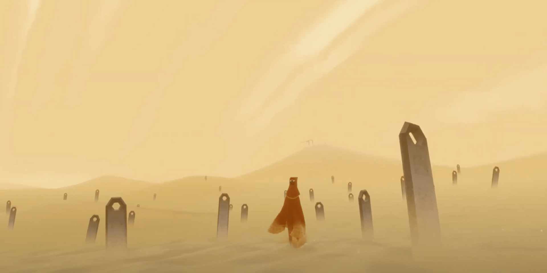 Du sable à perte de vue, un personnage dans une grande cape rouge et… encore du sable. Journey est un jeu vidéo de 2012 où on se promène dans le désert sans but annoncé. On est juste là pour :
